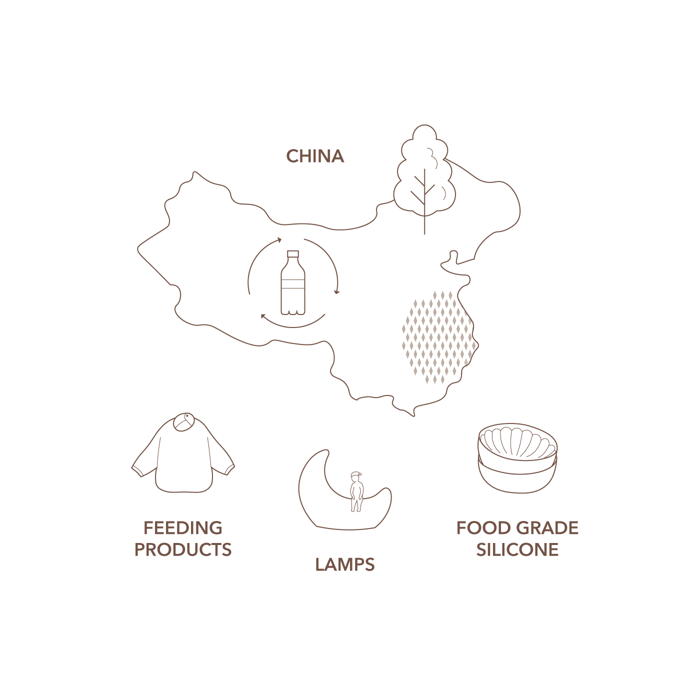 I Kina producerer vi vores hagesmække af genanvendt polyester, som er OEKO-TEX 100-certificerede. Det betyder, at produktet er testet for skadelige stoffer. Vores silikoneprodukter til fødevarebrug bliver også produceret i Kina. Fødevaregodkendt silikone er et godt materiale til børneservice, da det ikke går i stykker, ikke bliver skørt, revner eller skaller med tiden, og det indeholder hverken BPA, latex, bly eller ftalater.
