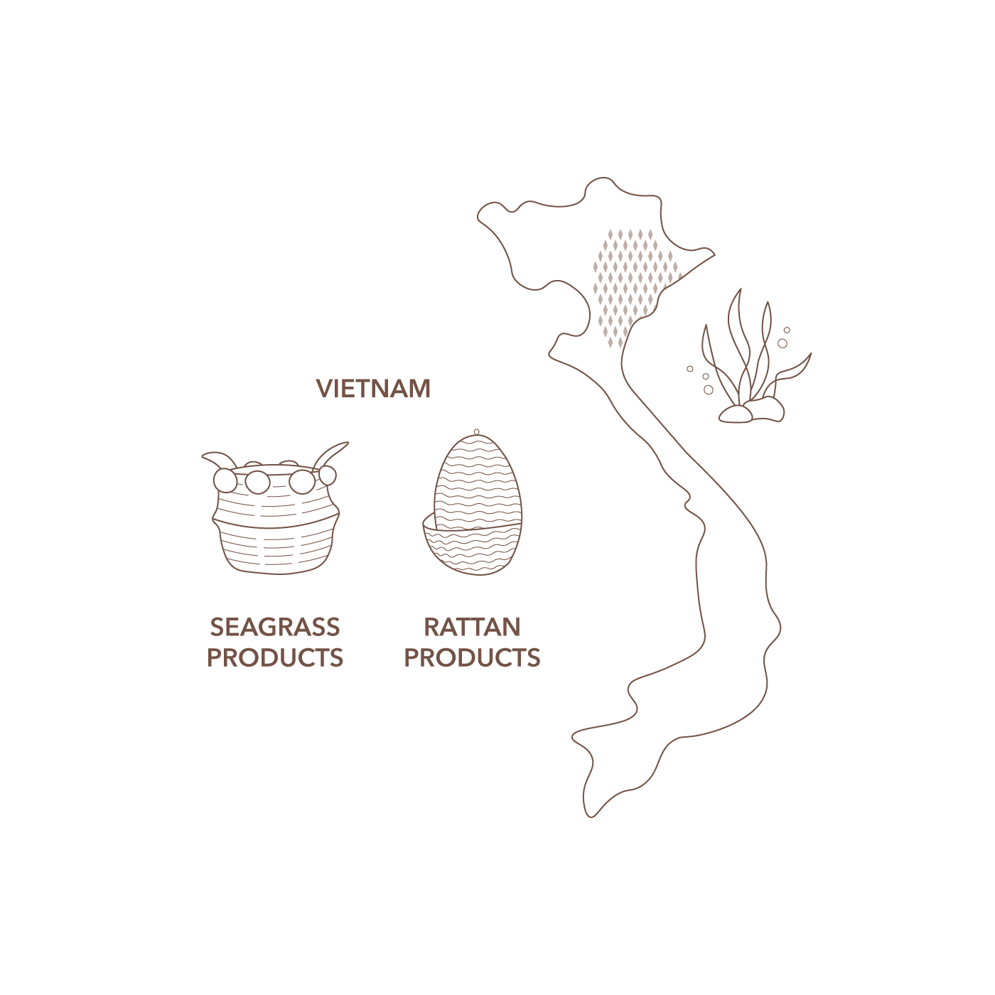 Vi bruger rattan og havgræs til vores kurve fra Vietnam. Rattan er et fordelagtigt materiale, fordi det vokser som ukrudt – hele 7 gange hurtigere end et træ producerer træ, og hver enkelt lian kan blive op til hele 200 meter lang. Havgræs er også et gunstigt materiale, da det kan optage op til 35 gange mere kulstof pr. vægtenhed end planter i regnskoven. Det er en hurtigt voksende plante og en fantastisk måde at bevare vores oceaners sundhed på ved at dyrke det og genbruge det i hjemmet. Begge materialer er biologisk nedbrydelige.